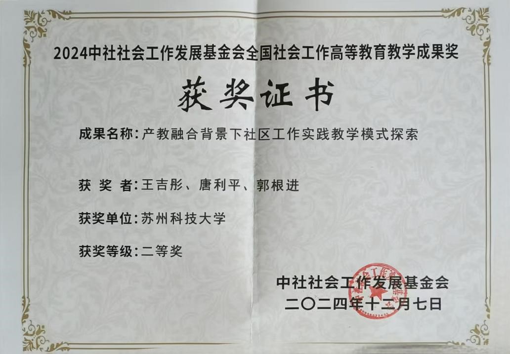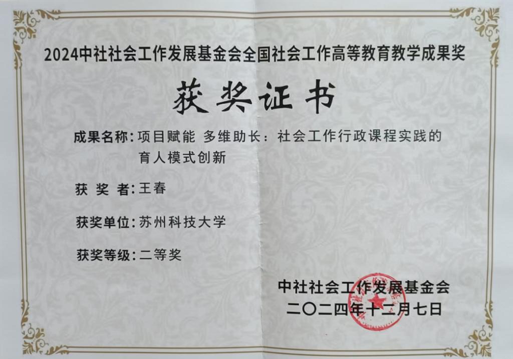 本次社会工作教育教学成果大赛工作重点面向开设社会工作本科教育层次人才培养的单位。评选范围为高等院校本科教育在课程、教学、教研、实验室建设、产教融合、协同育人、评价与资源建设等方面取得的具有创新性和推广应用效果好的教学成果。我校社会工作专业王春老师申报的《项目赋能 多维助长:社会工作行政课程实践的育人模式创新》,王吉彤老师申报的《产教融合背景下社区工作实践教学模式探索》这两项成果均荣获二等奖。