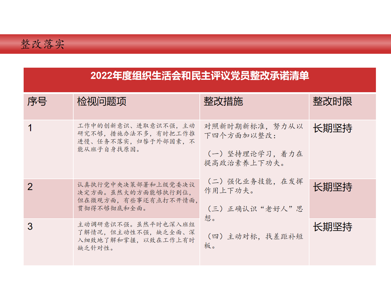 最后,进入会议第四阶段:整改落实。党支部委员会针对查摆和评议出的问题,列出整改清单,明确整改事项和整改措施、整改时限。党员自觉接受党员群众监督,根据问题清单作出整改承诺。