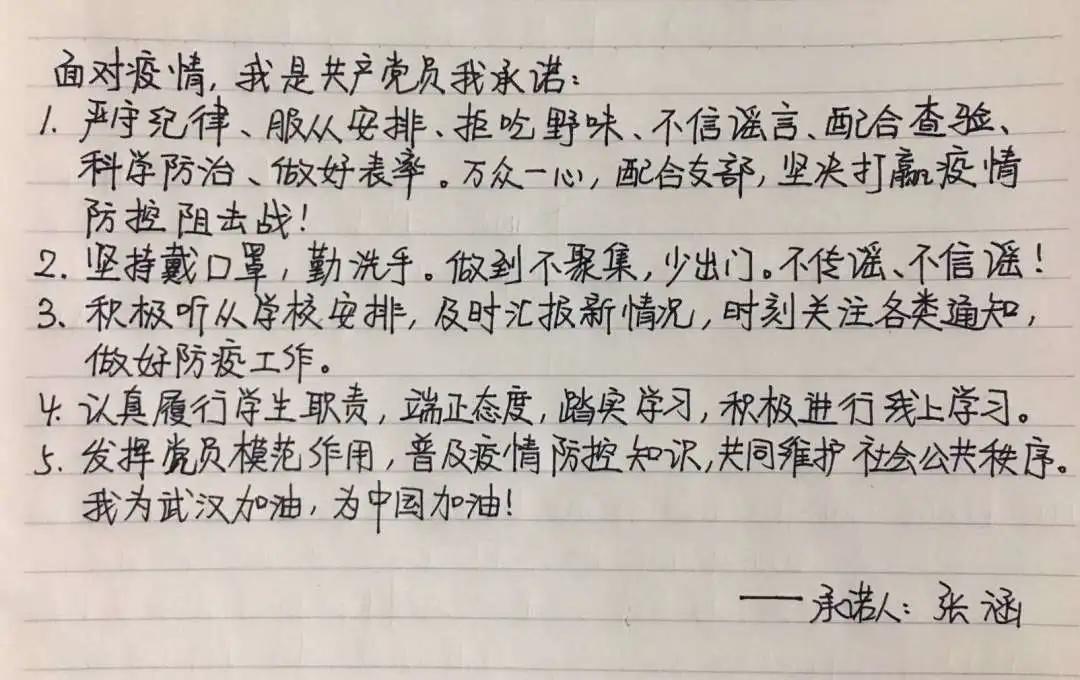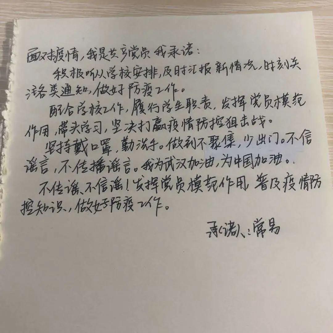 本科生党员通过“学习强国”学习平台重点学习习近平总书记对疫情防控的重要讲话和重要指示精神,加强个人理论学习,2月份支部党员学习强国日均学习积分在35分以上。支部结合微信群进行交流讨论,党员带头做到不信谣不传谣,用正能量为抗击疫情发声。在党支部号召下,党员同志们积极响应为抗击疫情发声,纷纷写下了自己的承诺书:“我是共产党员,我承诺,认真学习习近平总书记对新型冠状病毒感染的肺炎疫情作出的重要指示精神,把思想和行动统一起来...”支部党员以最鲜明的态度,践行党员的责任与担当。