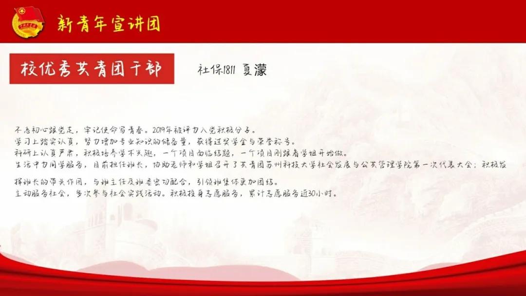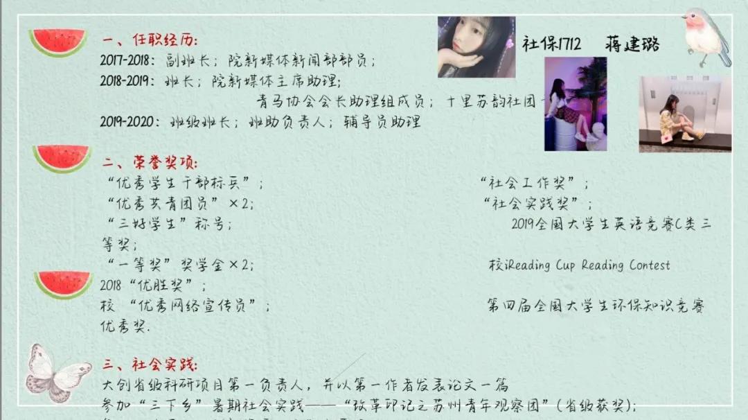 社保1811班夏濛同学从任职经历、活动负责、实习经历、其他等四方面详细介绍了自己进入大学的两年来经历的一些重要事情和从中得到的体验感悟。