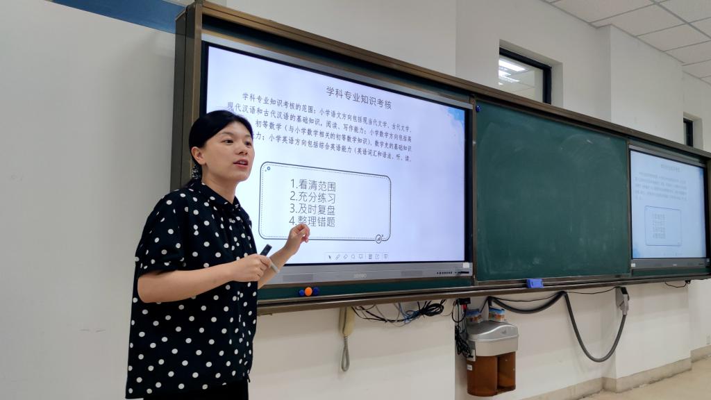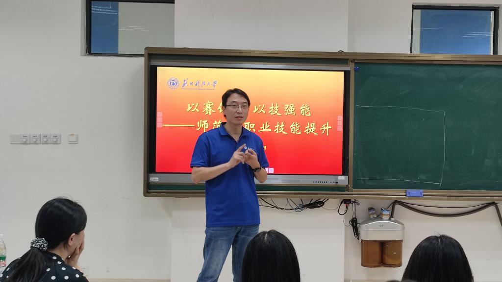 她结合个人成长经历,强调了江苏省师范生教学基本功大赛成绩带来的就业机遇以及对未来职业发展的影响;围绕“口语表达”“粉笔字和钢笔字”“模拟授课与课件制作”等比赛的重要环节,给学生们进行了专项辅导,传授了教师应聘的经验和做法,鼓励学生们不忘初心、砥砺前行,把握参赛机会,反复磨练提升技能。